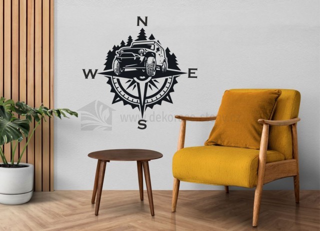 Samolepka off road 4x4 v pozadí s horami a kompasom.